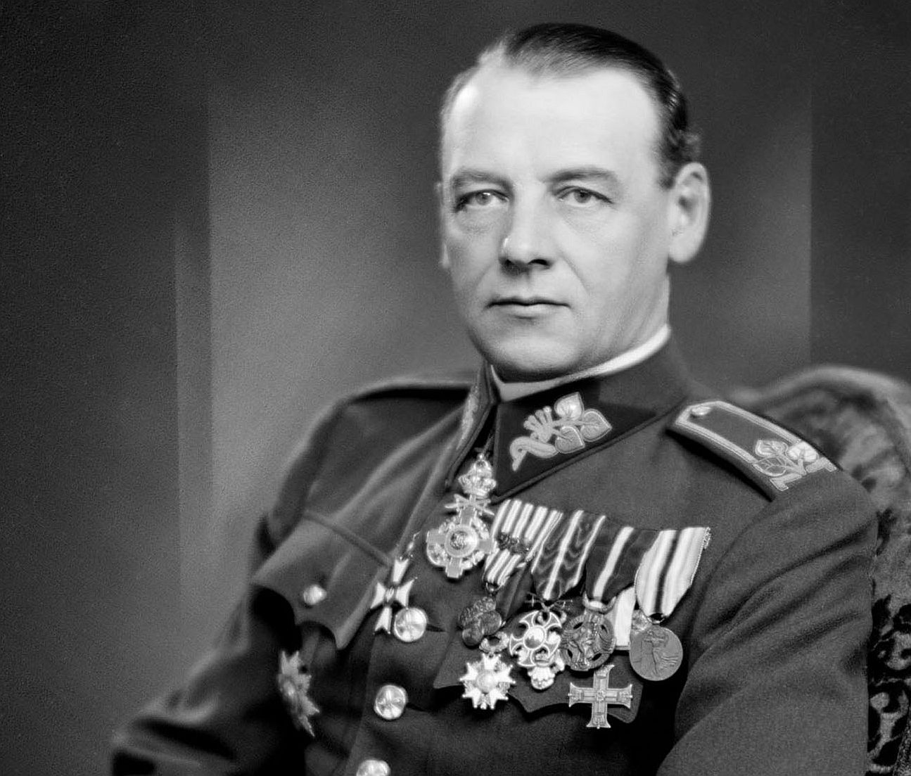 Skvěle viditelný exemplář medaile na hrudi generála Rudolfa Viesta, mezi Řádem sokola a Mezispojeneckou medailí za vítězství (9)