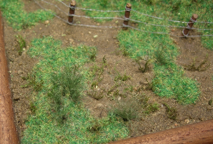 Následně jsem provedl nepravidelné zatravnění syntetickým posypem používaným železničními modeláři. Silné zatravnění jsem znázornil na střeše a záhozu, tam kde se to skutečně pečlivě provádělo. K lepení trávy používám tradičně Herkules. Divokou vegetaci pomohl z valné části vytvořit mech zpevněný bezbarvým lakem. Vyšší traviny jsem vytvořil z vláken motouzu.