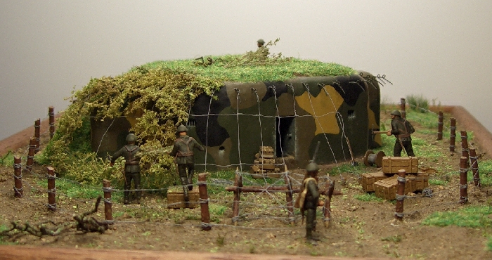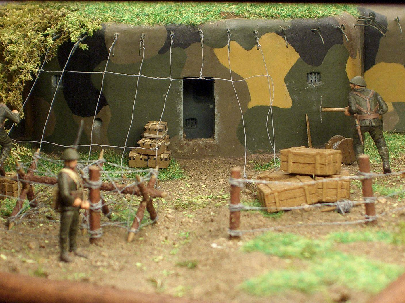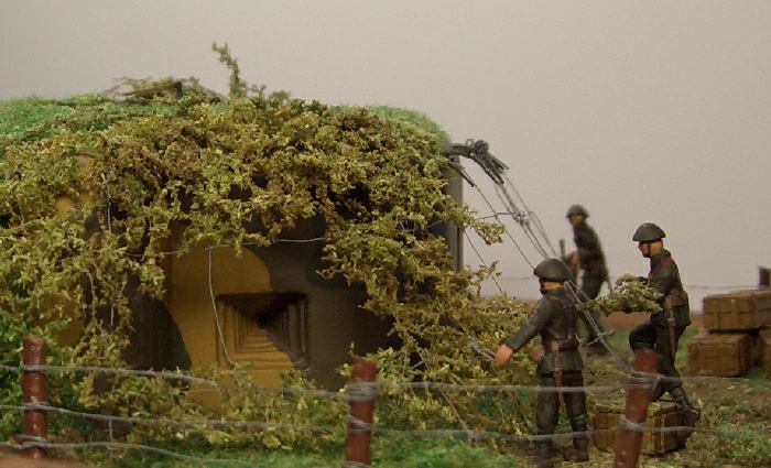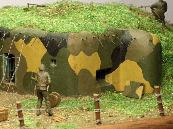 Část objektu jsem doplnil maskou uchycenou na hácích. Znázorňuje případ, kdy posádka řopíku použila vázací drát. Z tenčích párátek jsem nejprve vyřezal několik upevňovacích kolíčků. Nabarvil jsem je silně ředěnou Agamou dřevo a zasadil do míst kotvení masky. Pak jsem začal masku vyplétat z drátu průměru 0,1 mm. Vertikální pletení jsem ukončil za vchodem. Horizontální tvoří jen dva dráty, vedené po obvodu. Horní drát pokračuje přes vchod, kde končí smotaný na zemi. Dolní končí u vchodu, kde je pletení vynecháno z důvodu vstupu. V místě střílny je mezera na výstřel. Konstrukce masky dostala nátěr akrylátovou Agamou "hliníkový nátěr 46 Me".