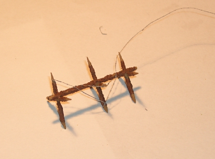 Pro ostnatý drát jsem sáhl mezi lepty od Extratechu. Plochost se v tomto měřítku ztratí a modelář má o práci méně. Ostnáč jsem ještě v rámečcích nabarvil stejně jako masku, hliníkovým nátěrem. Dráty užívané na překážky byly původně pozinkované. Dráty jsem jemně vyřezal z rámečků. Dál jsem pokračoval v omotávání na jednotlivé kolíky, až jsem dosáhl 3 řad nad sebou. Pro fixaci mi opět posloužil oblíbený vteřiňák. Za hodinu jsem měl překážku kompletně hotovou. Barvou jsem opravil špatně natřená místa a vše ošetřil matným lakem.