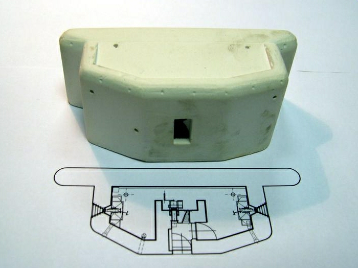 Vlastní objekt je sádrový odlitek s hladkým povrchem a minimem bublin. Tvarově zcela odpovídá předloze. Síla stěn i střílen je v pořádku. Střílny jsem shledal vzhledem k měřítku jako odpovídající. Dobře je vyřešena vchodová partie se schody a výřezem na mříž. Výstupy pro výdechy ventilace byly naznačené jen vývrtem skrz stěnu, bohužel v nesprávné výšce. Drobnou nesrovnalostí je jen špatný poloměr zaoblení křídla. U zesílených objektů byl cca 600 mm, proto jsou ochranná křídla u těchto objektů viditelně kulatější.