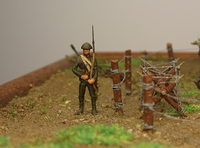 Průchod v obvodové překážce býval přehrazen přenosnou překážkou zvanou „Španělský jezdec“. Rozhodl jsem se opět pro improvizovanou konstrukci ze dřeva. Kostru jsem vyrobil z párátek. Naznačení kůry je pomocí nepravidelně naneseného pilinového posypu přilepeného disperzním lepidlem. Na neoloupanou část s kůrou jsem nanesl směs barev dřevo+zemitá hnědá+červená. Oloupané části jsou v barvě dřeva. Výplet proveden opět ostnatým drátem na základě dobových fotografií. Drát dostal stejnou barvu jako na překážce.