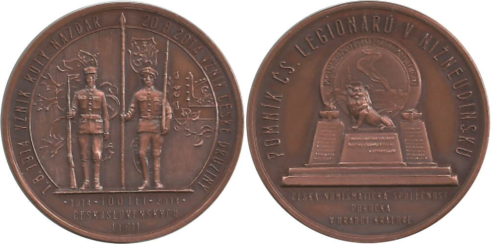 Odkaz Československých legií a stoleté výročí od jejich vzniku se stalo inspirací pro pobočku České Numismatické Společnosti z Hradce Králové. Pod taktovkou tamějšího člena Martina Foukala, vznikl návrh medaile, realizovaný v několika materiálových variantách. Díky relativně nízkému nákladu emise se jistě jedná o unikát, který si u sběratelů zaměřených na vojenské dějiny určitě získá zaslouženou pozornost. Aversu vévodí postavy dvou legionářů, stojících na podstavci tvořeném plastickou linkou. Legionář na levé straně je ve francouzské uniformě se zbraní u nohy, za ním se nalézá reliéf českého lva v podobě, jaké byl na zástavě „Roty nazdar“. Na tu odkazuje také nápis v polokruhu s datem 1. 8. 1914 a nápisem „VZNIK ROTY NAZDAR“. Postava napravo je v uniformě z ruské fronty, přičemž zbraň má na rameni a v pravé ruce drží kopí. Také v jeho případě se v pozadí nachází symboly spojené s český národem vycházející z tzv. Svatováclavského praporu České družiny. Tomu odpovídá i nápis po levici legionáře, kde je opět v polokruhu vyvedeno datum a nápis „VZNIK ČESKÉ DRUŽINY“. Letopočet je ovšem vyveden chybně a tak místo 20. 8. 1914 je vyraženo 20. 8. 2014. Pod podstavcem se stojícími postavami legionářů se nachází nápis „100 LET ČESKOSLOVENSKÝCH LEGIÍ“ s letopočty 1914 a 2014. Kombinace kopí a podstavce člení opticky avers na tři části rozdílné velikosti. Reverzní části jednoznačně dominuje vyobrazení již neexistujícího pomníku Československých legionářů před nádražím v Nižněudinsku v ruské irkutské oblasti. Ten vznikl jako připomínka padlých příslušníků ČS. vojska na Rusi v roce 1918. V horní části nesl nápis „PRO NÁROD PRO VLAST ZLATOU PRO SVOBODU“, který je dobře patrný i na medaili. Další nápisy již nejsou zcela čitelné. Dále se v polokruhu kolem pomníku nachází nápis „POMNÍK ČS. LEGIONÁŘŮ V NIŽNĚUDINSKU“. Pod pomníkem je další nápis a to „ČESKÁ NUMISMATICKÁ SPOLEČNOST V HRADCI KRÁLOVÉ“.
