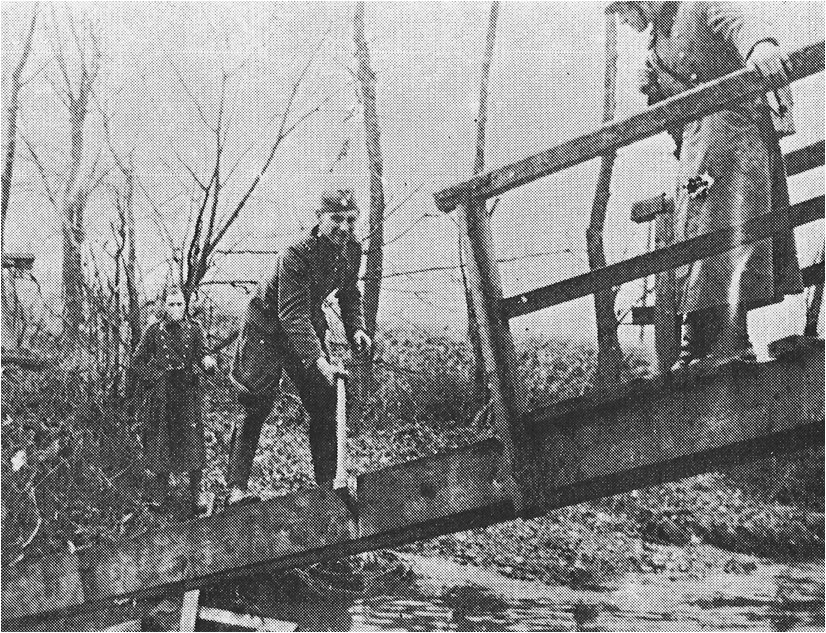 Příslušníci četnického pohotovostního oddílu ruší mostek v Moravské Chrastové na demarkační čáře na podzim 1938 (2)