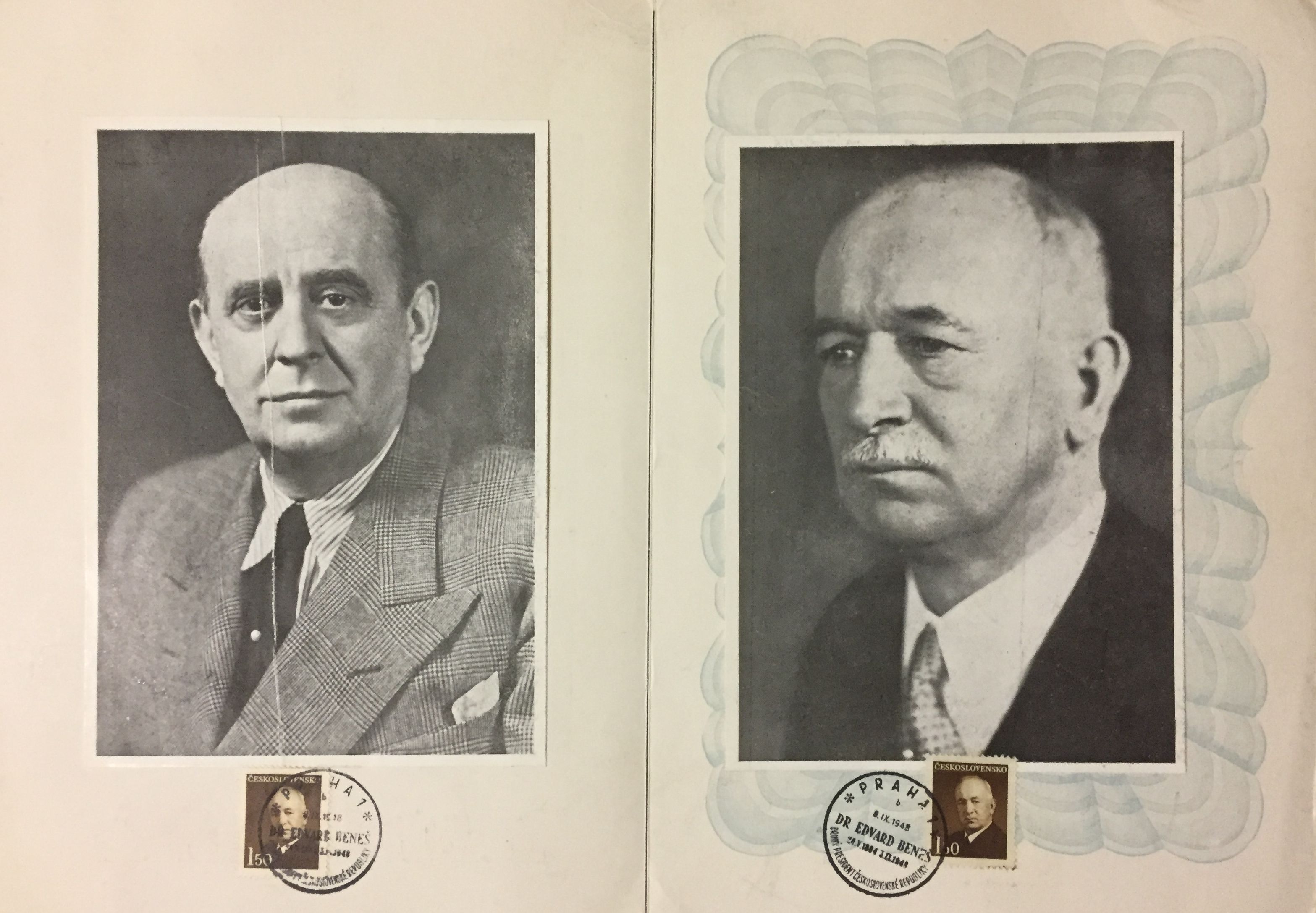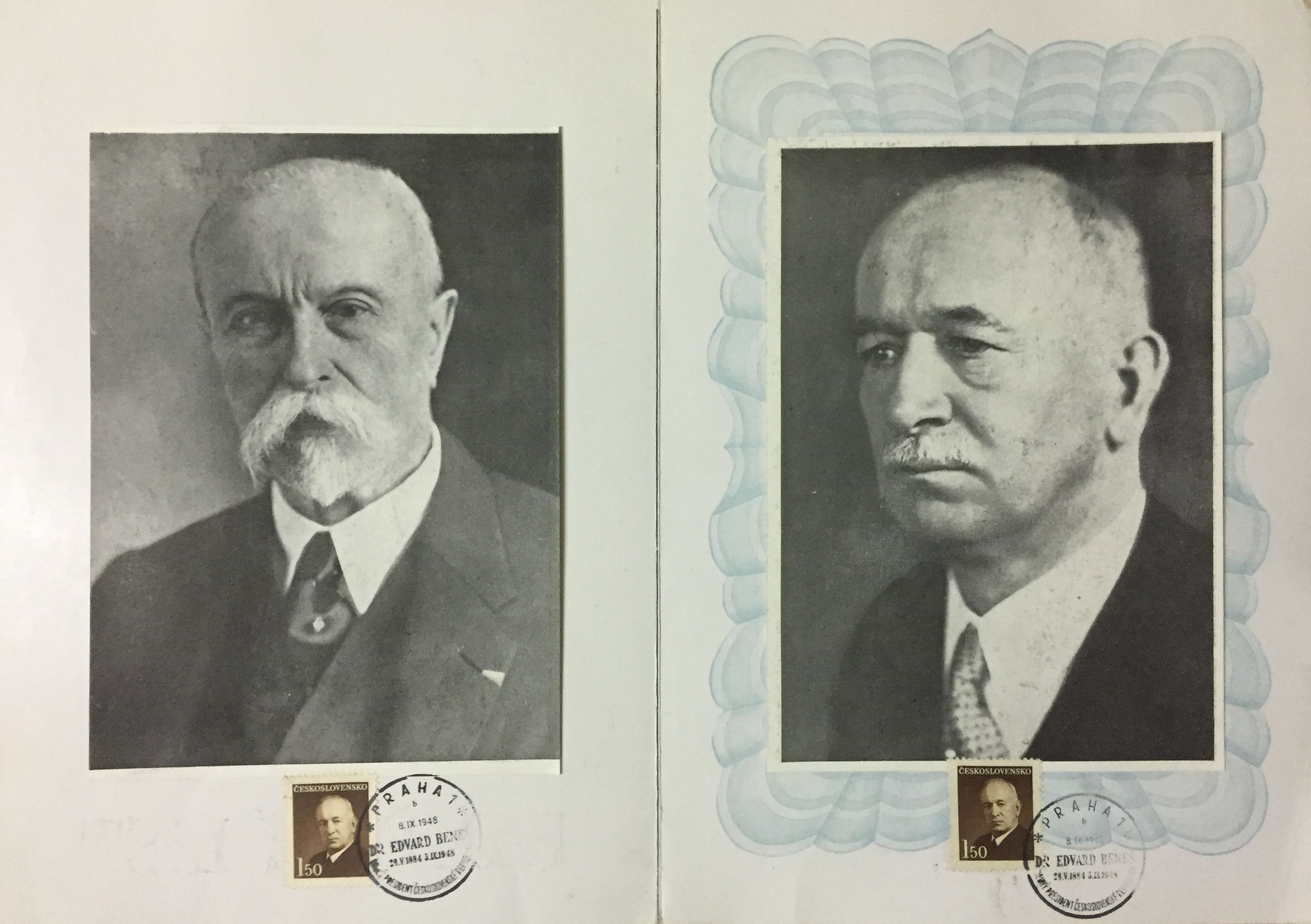 Od roku 1918 se naše státní zřízení ubírá republikánskou cestou. Jeho součástí je přirozeně nejvyšší ústavní funkce – prezident. Za uplynulých sto let se v tomto úřadě vystřídalo několik osobností. Oslavovaných či trpěných. Výrazných nebo konfekčních. Vždy reprezentujících dobu, kdy vykonávaly úřad. Každá z nich měla jiný životní příběh. Stejně tak se vyvíjelo jejich postavení ve společnosti i hierarchii státu. Snad nejmarkantnější rozdíl můžeme vypozorovat v přístupu veřejnosti. Vážnost prezidentské funkce je samozřejmě stále poměrně vysoká. Srovnáte-li ovšem jak občanská společnost reaguje například na příjezd prezidenta republiky do některé obce dnes a v letech první československé republiky, ten rozdíl je více než markantní. Zcela se vytratily slavobrány, bohatá vlajková výzdoba, nastoupené útvary válečných veteránů, policie anebo hasičů. Ty všechny vystřídaly hloučky příznivců, zástupci regionální politiky a když je dobře, uvítací výbor v lidových krojích. Snad se do budoucna tato situace změní. Zatím se můžeme dívat na staré filmy. Obdivovat fotografie. Případně se těšit z artefaktů oněch minulých let. Mě se to částečně povedlo. Na jedné z aukcí České numismatické společnosti jsem za velmi slušný peníz získal dva pamětní listy věnovaný prezidentu republiky Edvardu Benešovi (a). V každém je doprovázen jinou významnou osobností československé státnosti. Jedním z nich je jeho předchůdce v úřadě, filozof a profesor, Tomáš Garrigue Masaryk (b). Druhým je syn prvního prezidenta. Dlouholetý diplomat, ministr zahraničí exilové vlády i poválečné ČSR, Jan Masaryk (c).