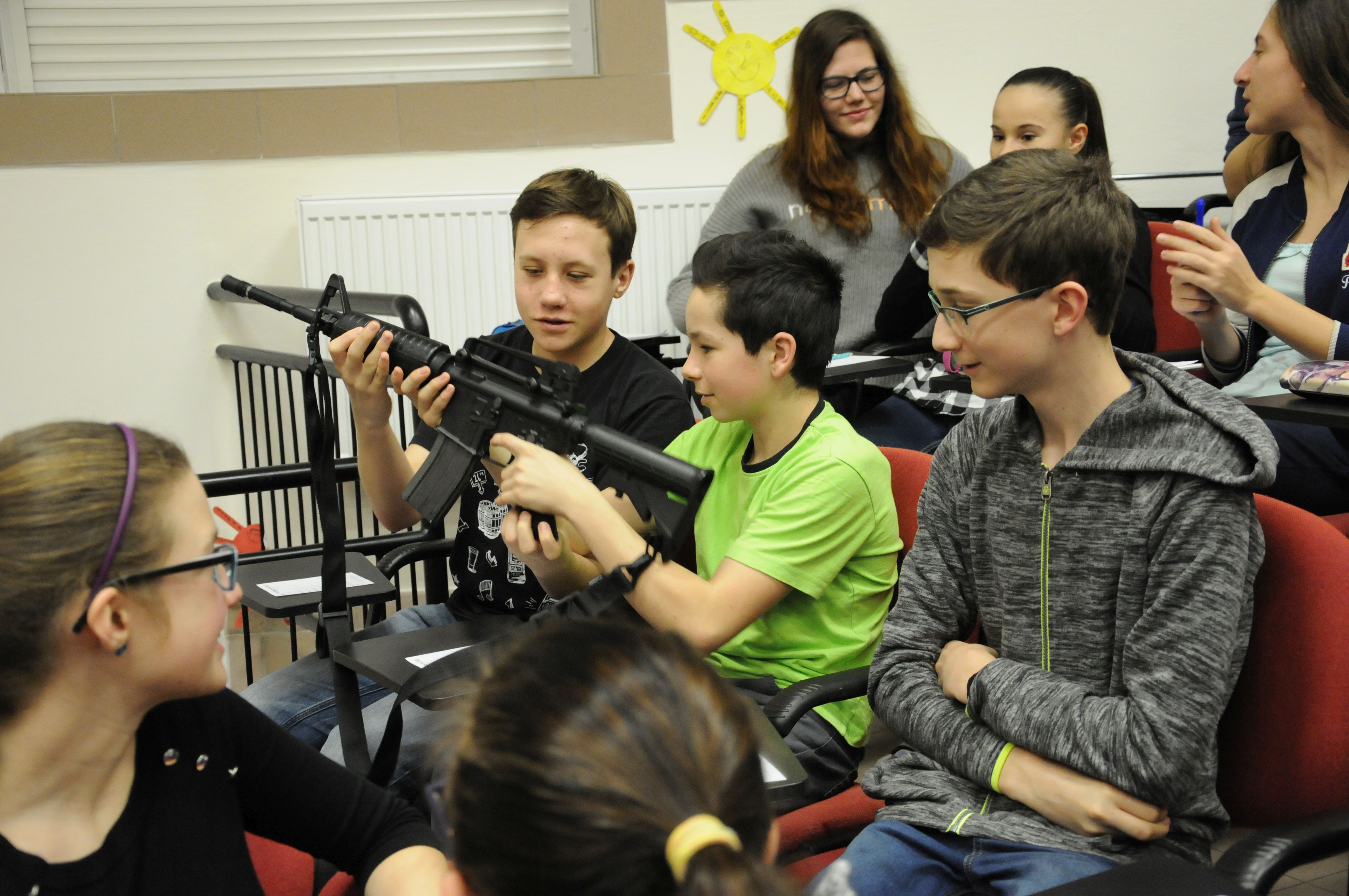 Žáci si pak mohli potěžkat karabinu. Přednáška pokračovala informací o výzbroji. Rozhodně nejsilnějším okamžikem se stala část zmiňující zahraniční mise. Nejprve byl připomenut občan obce Štěnovice Nikolaj Martynov, který zahynul právě na zahraniční misi, konkrétně v Afganistánu. Dojetí vyvolal videoklip nazvaný „Píseň padlých“, věnovaný příslušníkům AČR, kteří položili své životy při plnění úkolů v zahraničí. Také výčet realizovaných misí byl rozhodně zajímavý. Jako poslední přišly na řadu kvízové otázky.