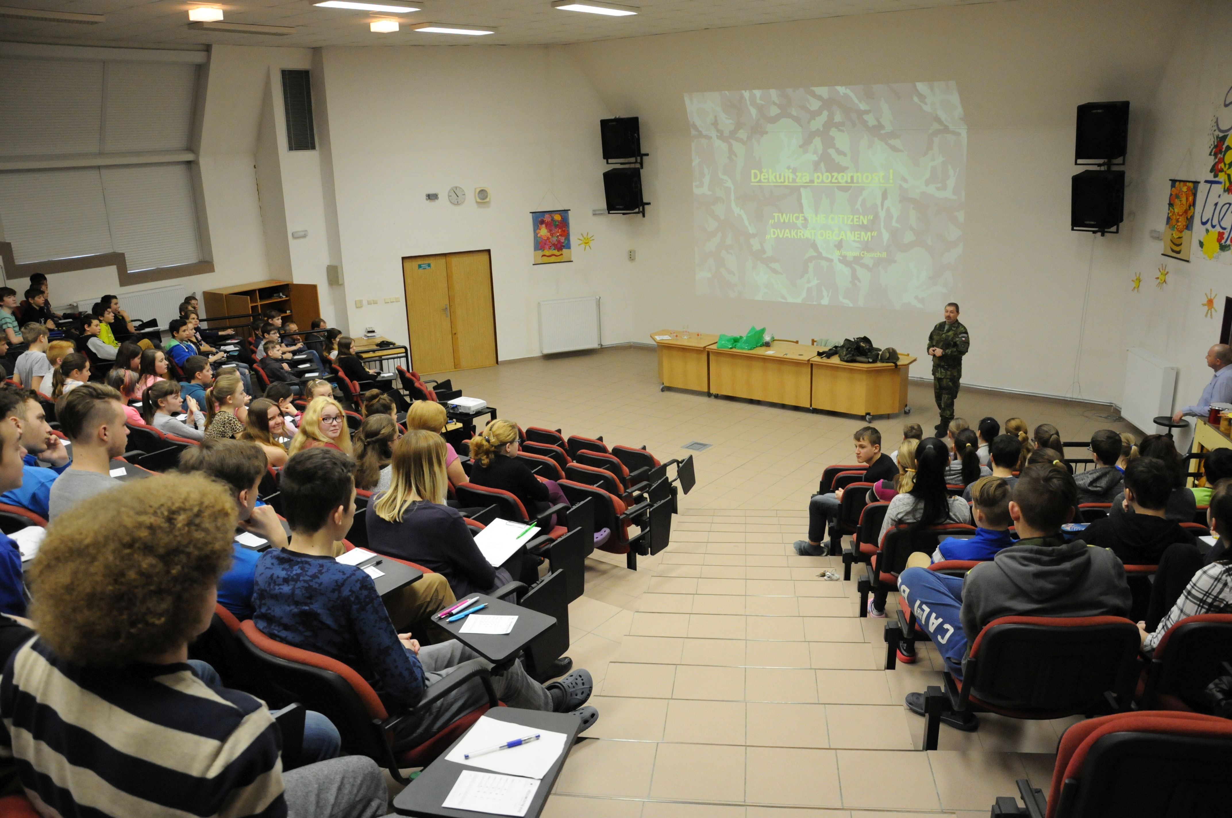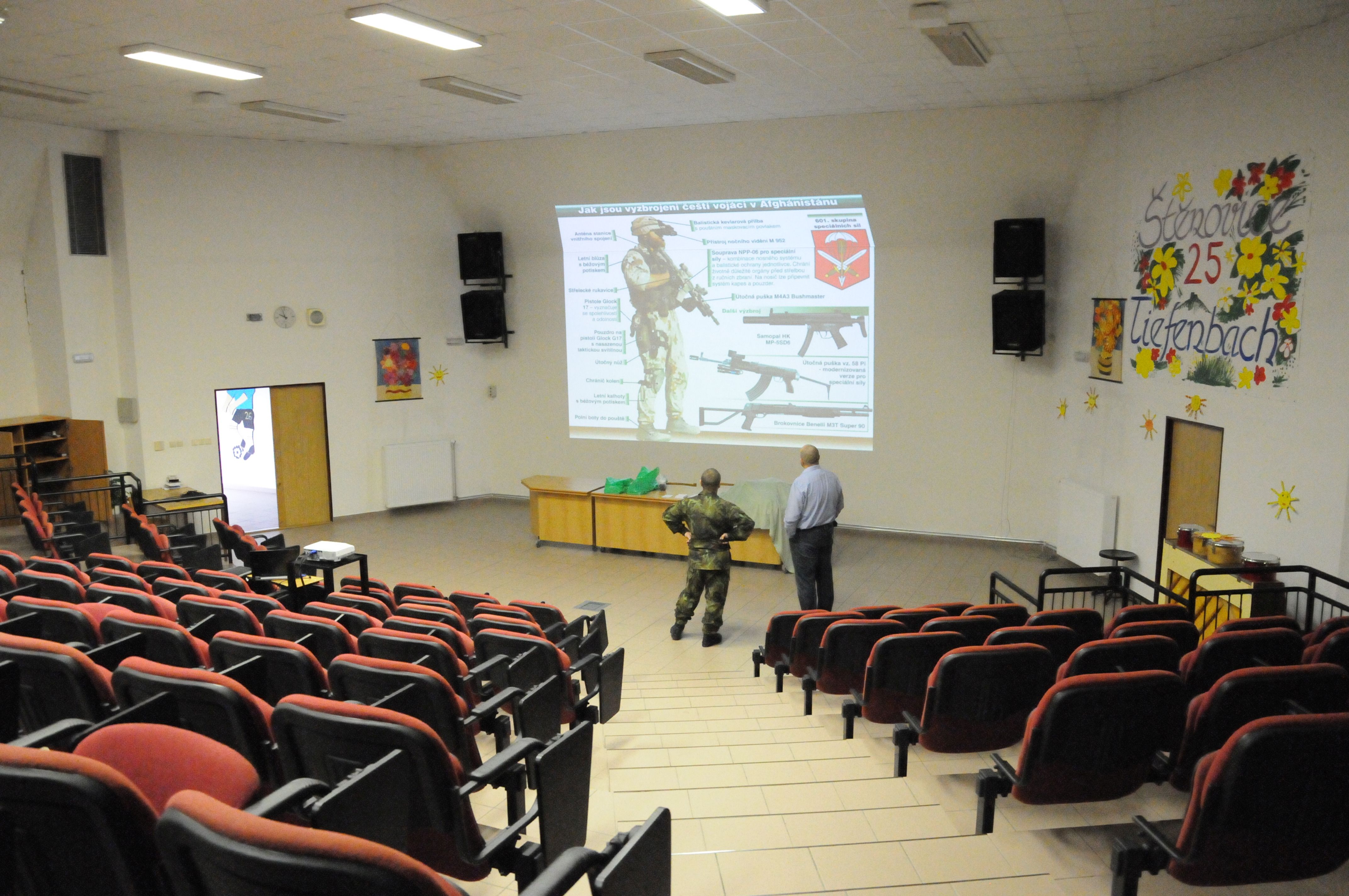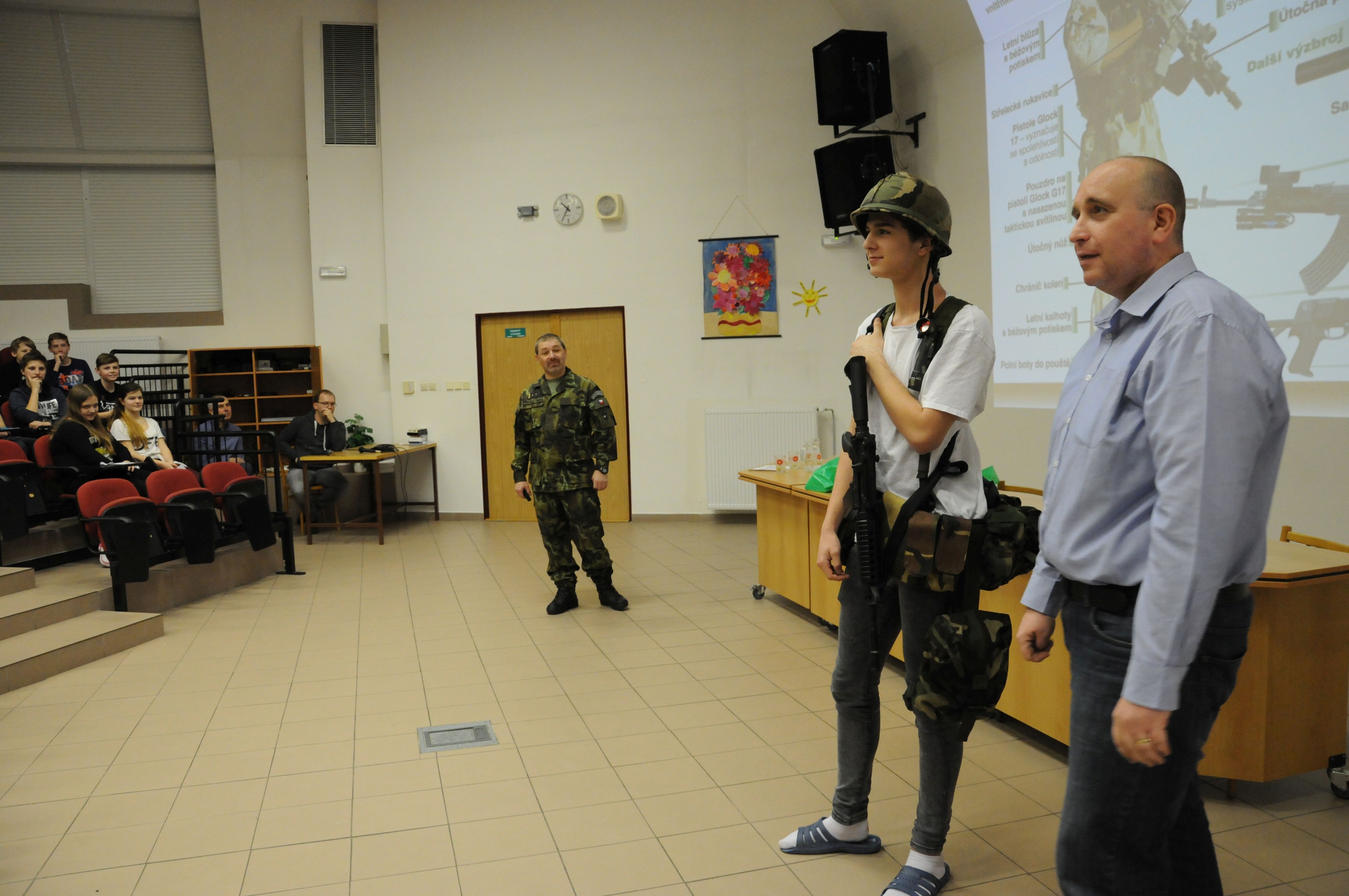 Přednáška byla panem Líbezným vedena interaktivní formou. Žáci se mohli již od začátku zapojovat a odpovídat na jednoduché otázky. Dokázali odhadnout většinu diskutovaných věcí. Velký zájem vyvolaly pestré znaky jednotlivých útvarů a především otázka „Speciálních sil“ v naší armádě. Ve chvíli, kdy došlo na popis výstroje příslušníků AČR, vstoupila na scénu praktická ukázka. Jeden dobrovolník byl v několika krocích vybaven nosným systémem, přilbou a replikou zbraně o celkové hmotnosti kolem 10 kg. Vyzkoušel si pohyb s takovou zátěží a sdělil své pocity ostatním, přičemž dával najevo údiv nad nesenou vahou.