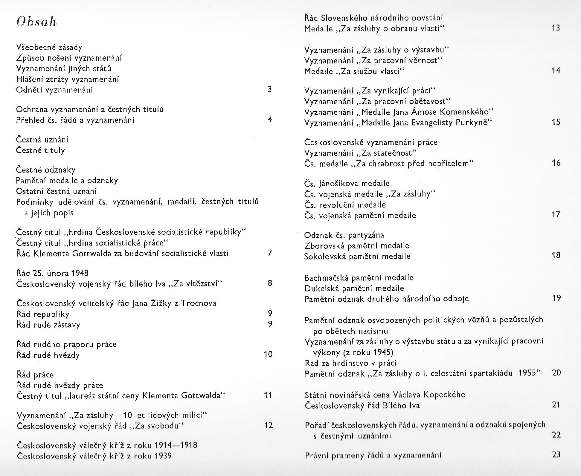 Sešit je plný doprovodných informací. Kromě ideologicky zabarveného úvodu, kde si mimo jiné můžeme přečíst definici významu vyznamenání jako - cituji „….uznání socialistické společnosti, kráčející ke komunismu“, se zde dozvíme poměrně široké penzum základních informací spojených s problematikou vyznamenání v Československu. Na prvních stranách jsou uvedena pravidla udělování, nošení i postup pro případ ztráty. Samozřejmě nechybí pravidla pro odnětí a ochranu. Následuje seznam řádů a vyznamenání. Výčet obsahuje třicet devět v té době aktivních. Následuje sedm vyznamenání, která se již neudělovala. Aktivní jsou v následujících kategoriích: