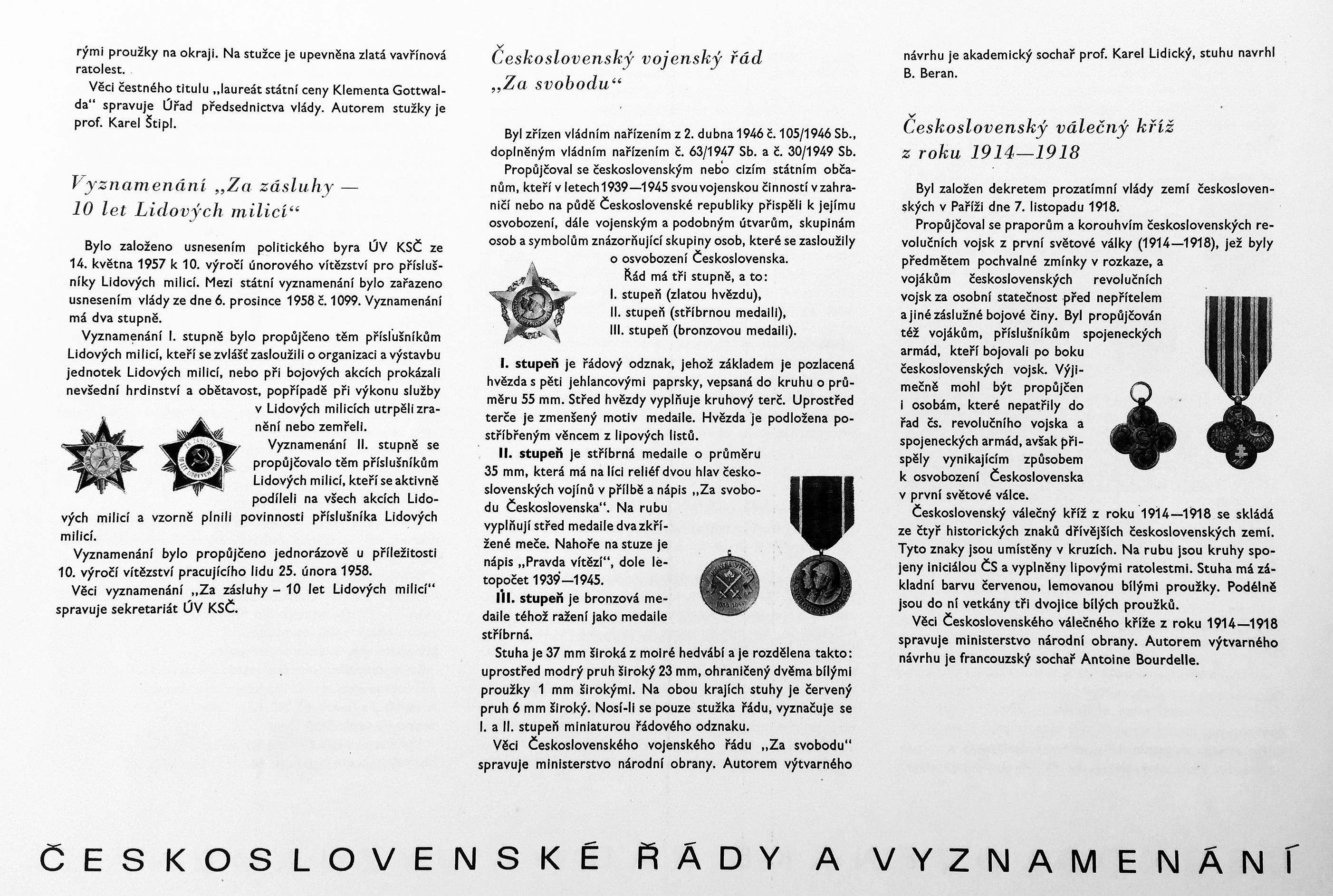 Jako další jsou uvedeny statě věnované čestnými titulům a jejich odznakům, čestným uznáním, čestným odznakům i pamětním medailím. Nejzajímavější je bezesporu popisná část detailně věnovaná čtyřiceti dvěma položkám – tedy méně, než badatel nalezne na listech s ilustracemi. Odstavec vždy obsahuje vyobrazení popisované položky ve stupních šedi - averz/reverz -, historii, zákonný podklad a podrobnější popis. Nejrozsáhlejší je samozřejmě popis řádu „Bílého lva“ pro cizince. U oborových ocenění ilustrace ovšem chybí. Následuje výčet právních podkladů pro řády a vyznamenání. Zcela na konci se nachází obsah s doplněním právních norem vydaných v období těsně před tiskem publikace, tj. léta 1963 a 1964.