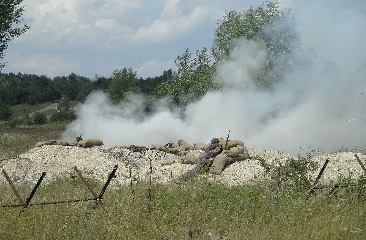 Rakouská armáda brání své zákopy. Snímek z rekonstrukce zborovské bitvy u příležitosti stoletého výročí v Milovicích (1)